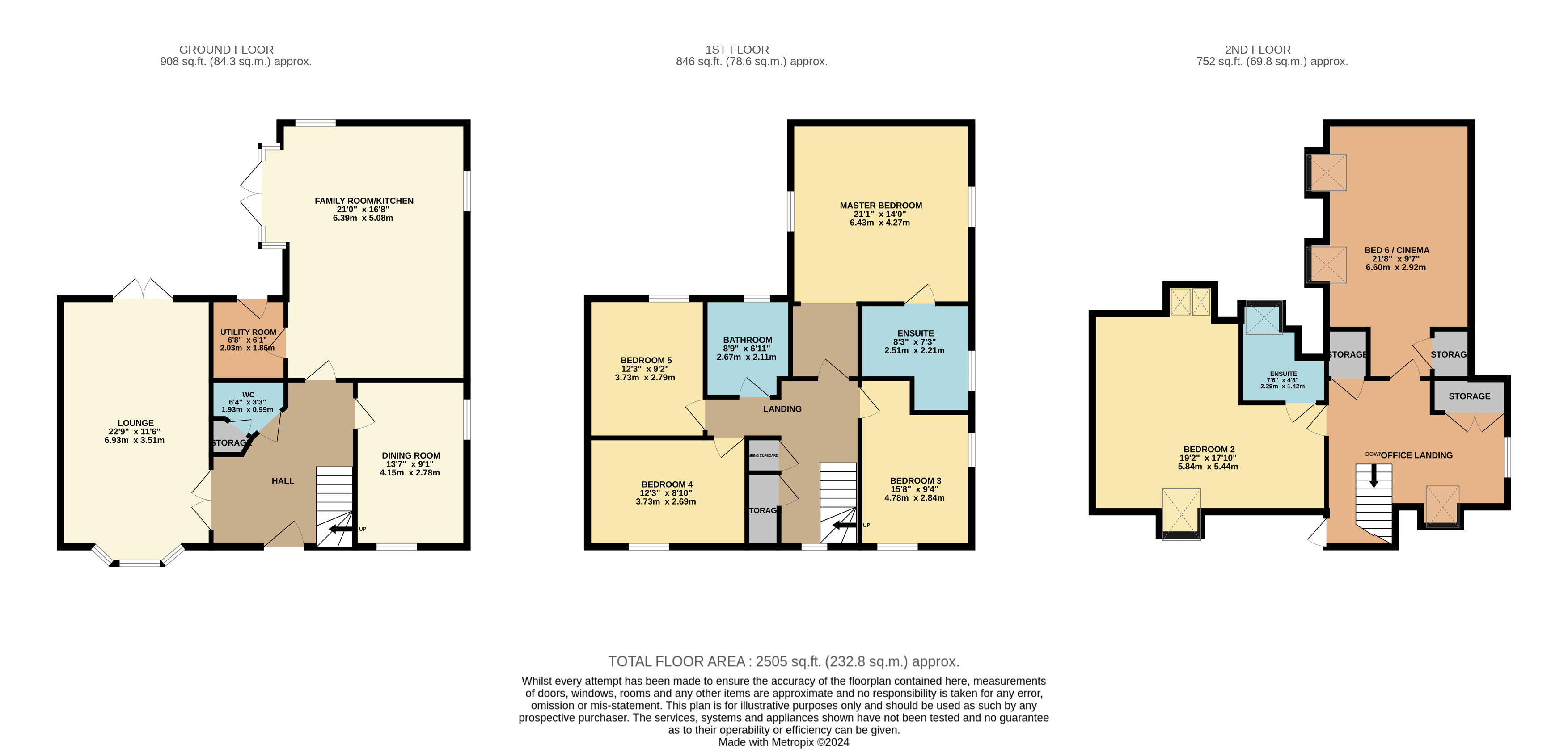 Seconds Floor - Office Space with built in double cupboard and separate storage cupboard, large Bedroom with built in wardrobes and En-suite Shower Room, Cinema Room (or 6th Bedroom).