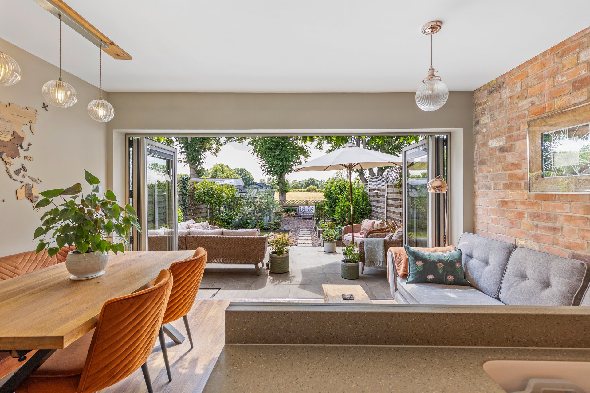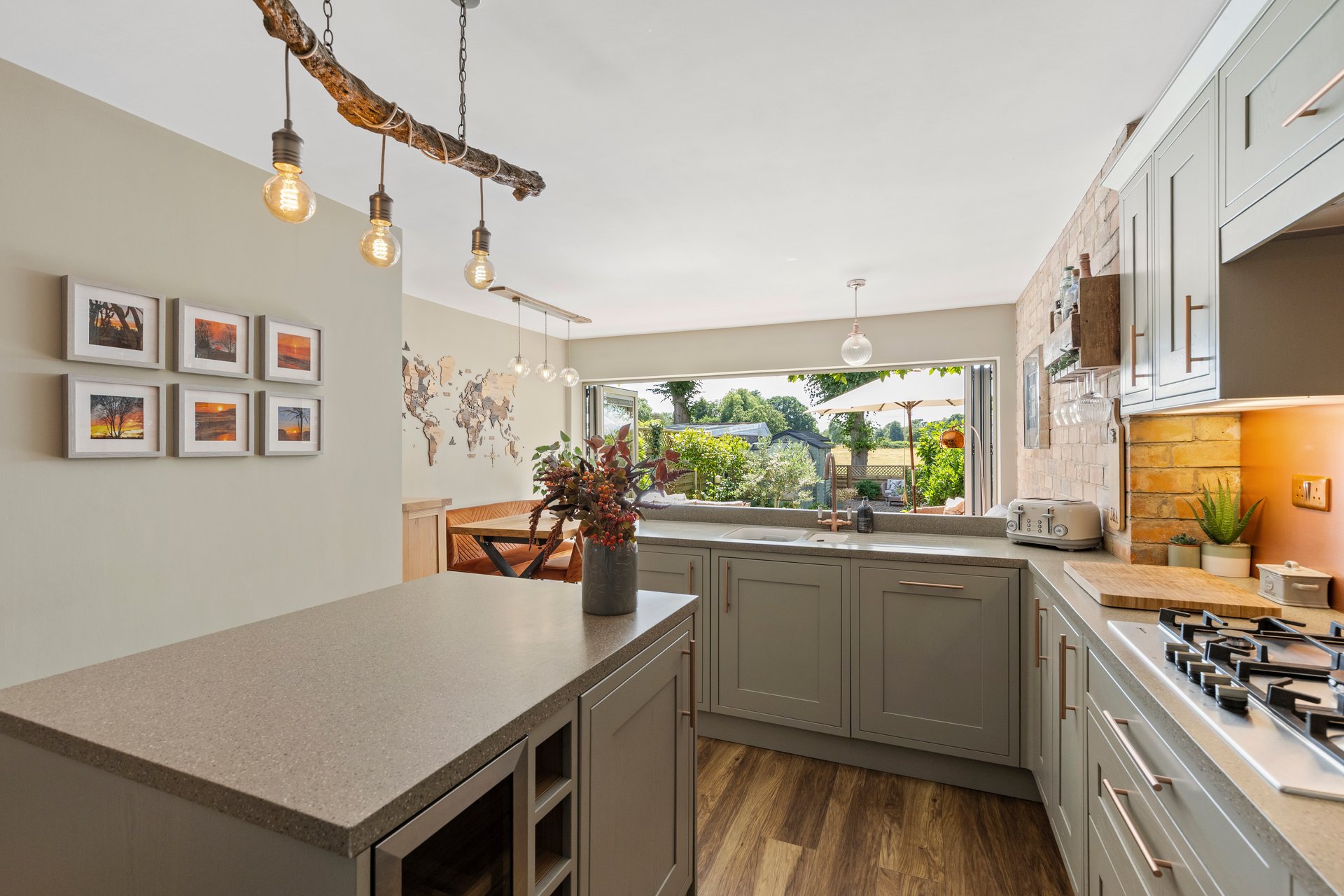 The Living Kitchen benefits from underfloor heating and the actual kitchen area has been designed and fitted with classic sage green cabinets with accented rose gold handles and splashback, a granite worktop and all fitted appliances, and has a cubed island with wine chiller fitted. The dwell area of the kitchen has space for a dining table and also a sofa area to relax and enjoy the stunning view of the garden and the fields. The decor has been well thought out, there are bi-fold doors which let in the natural light and open out to the spacious patio and landscaped garden.