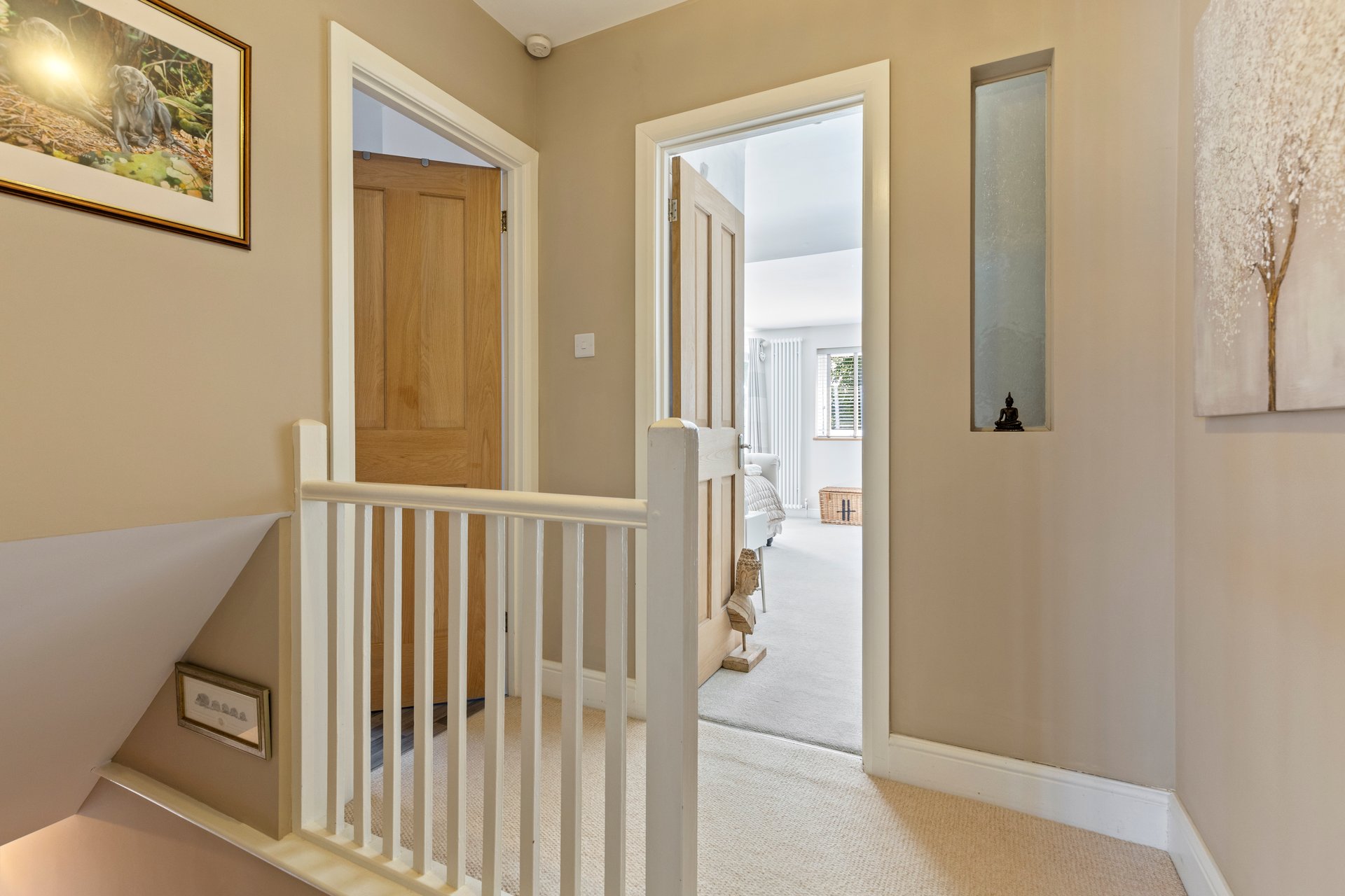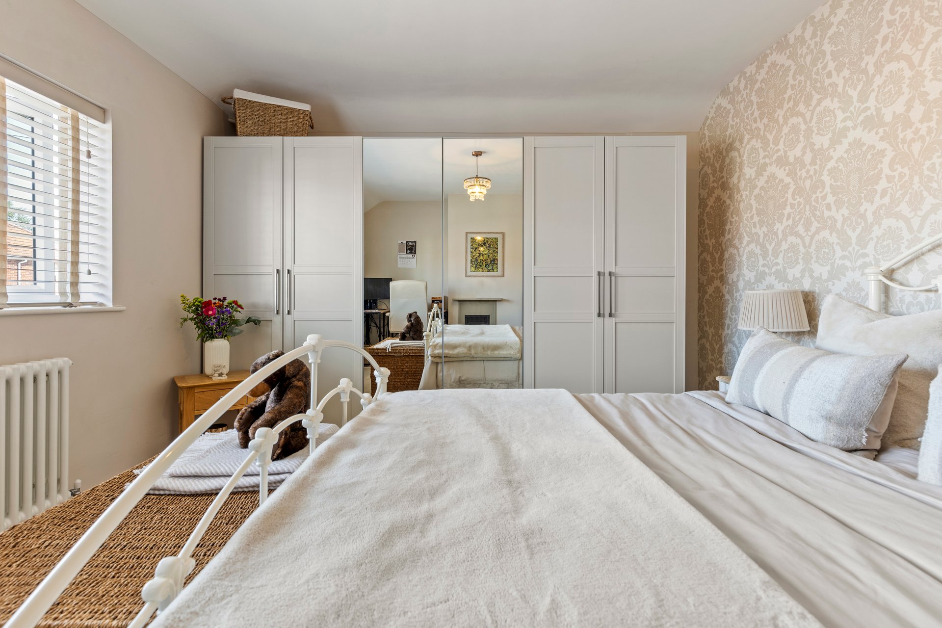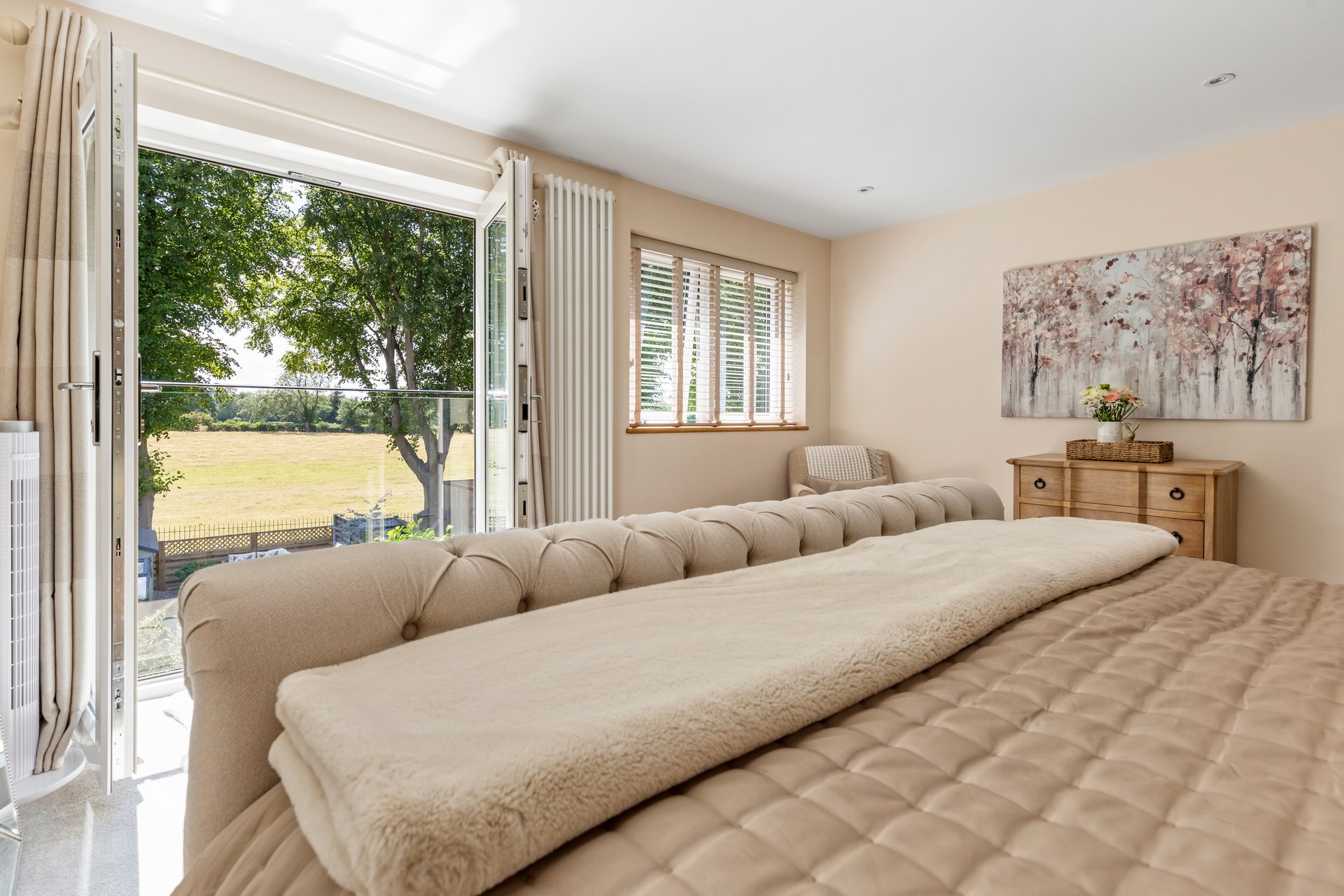 The Principal bedroom has so much space, there's room for a sofa or chaise, super kingsize bed and wardrobes, with a window and a juliette balcony which overlook the garden and the open fields, the room is bathed in natural daylight.