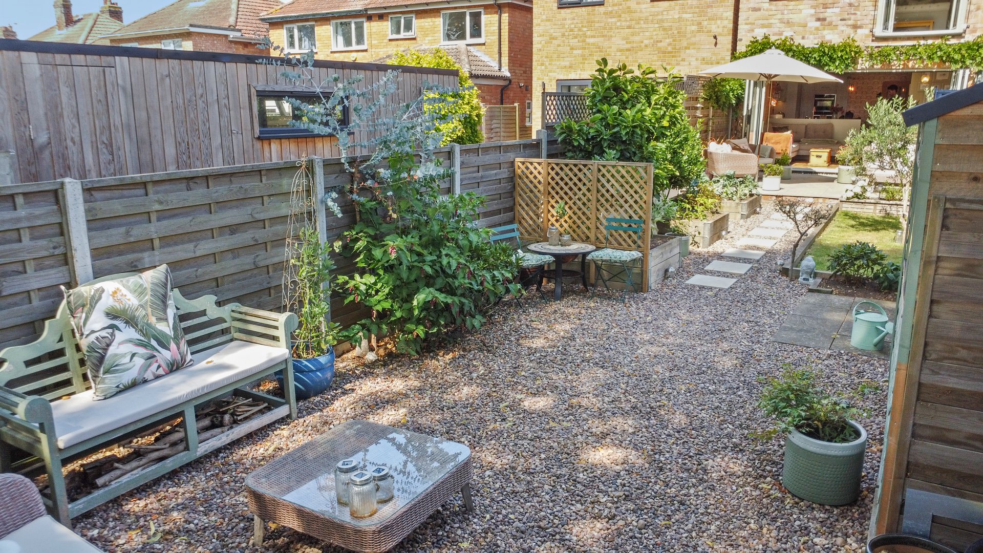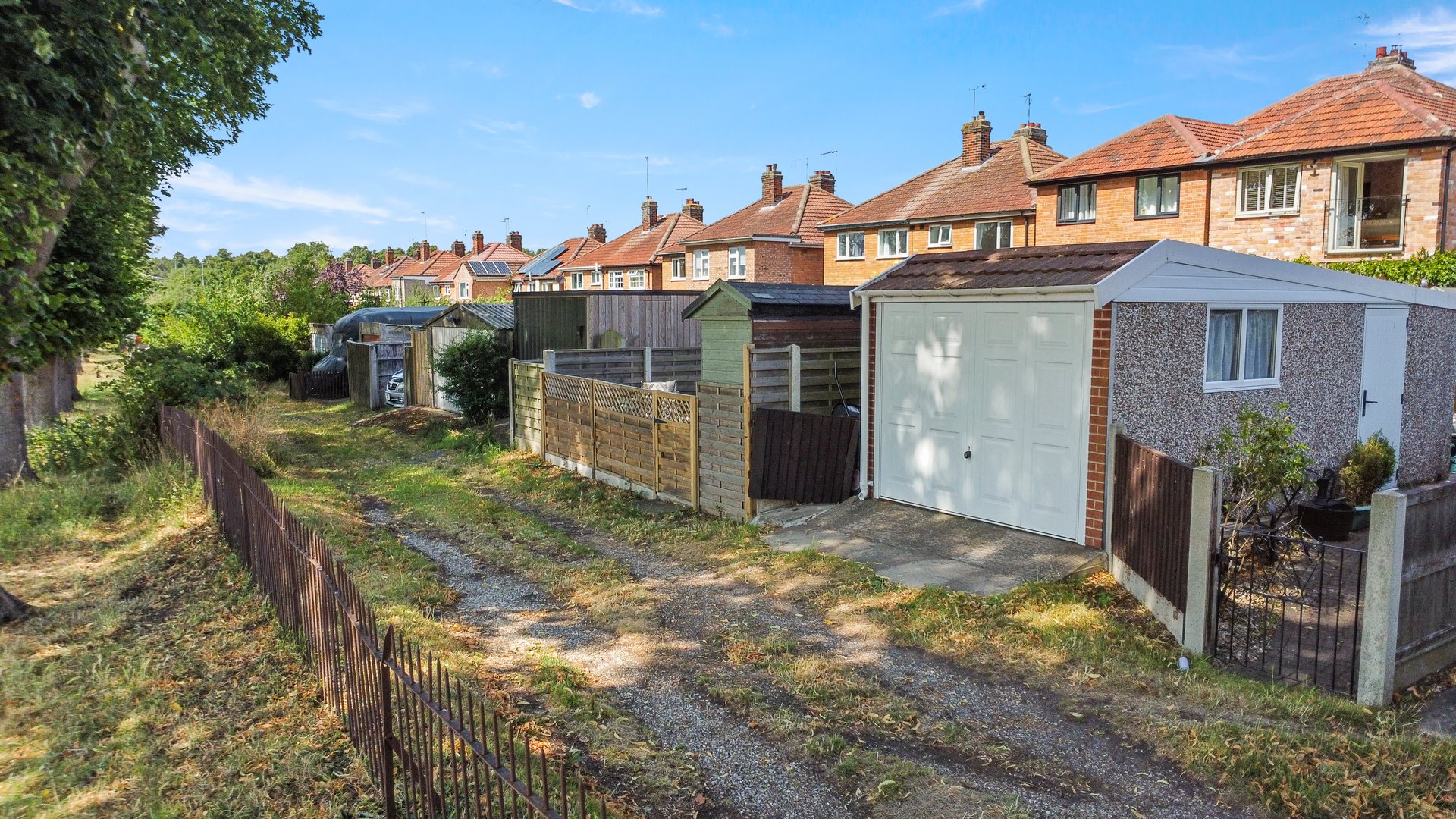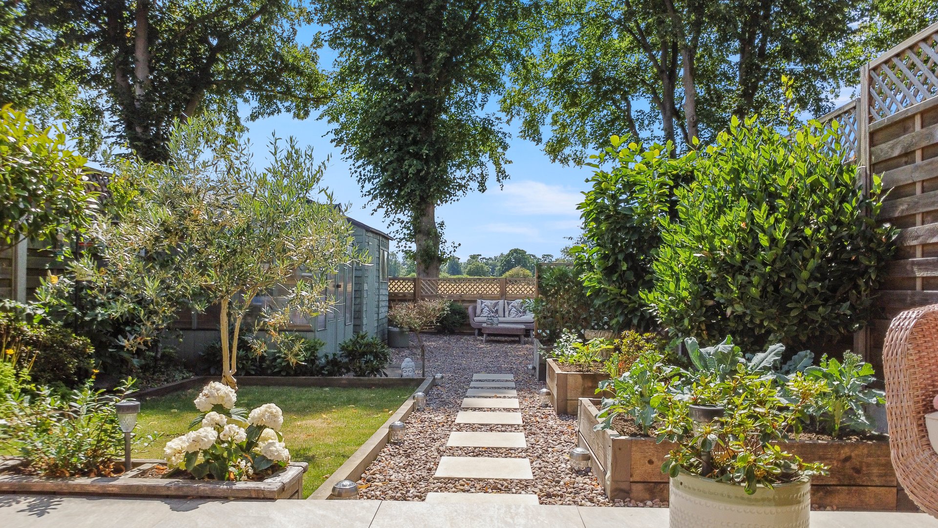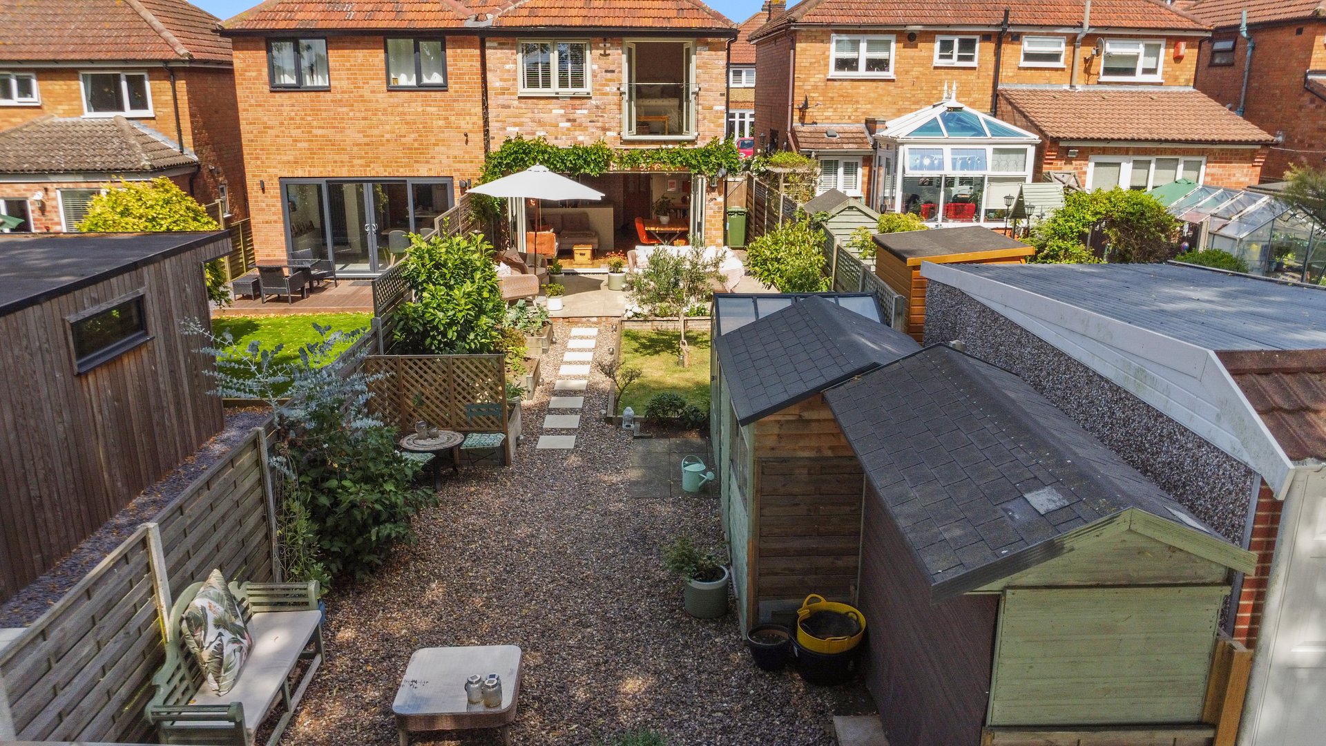 To the rear of the property there is a substantial patio directly outside the bi-fold doors with space for garden furniture, the rest of the garden is landscaped to a lawned area, with some well stocked and planted raised borders, the bottom third of the garden is gravelled with further seating areas and two small garden sheds. The rear boundary enjoys field views and has a pedestrian gate that leads out to a quiet service lane for properties that have garages to the rear, meaning that if desired this property could have a garage or vehicle access to the rear.