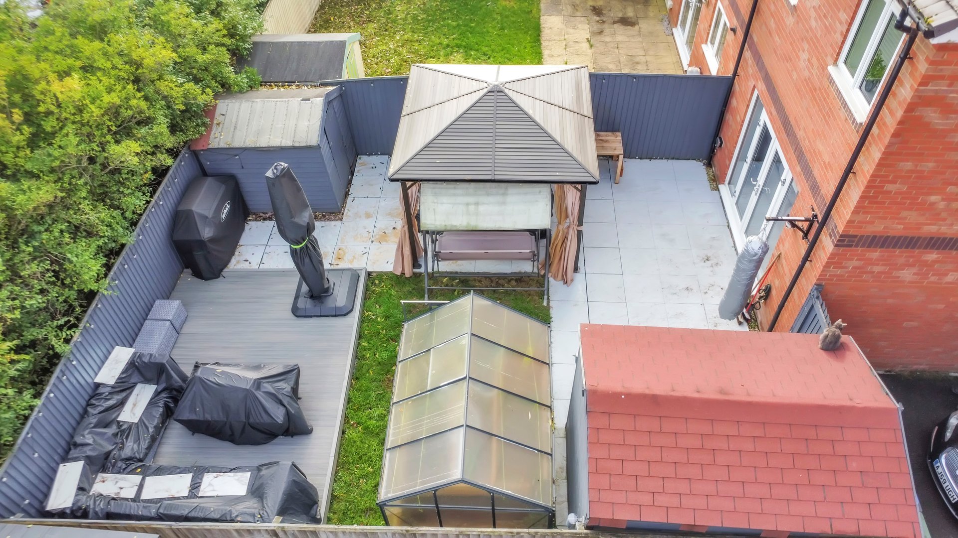 Outside, the rear garden is a real highlight. It has been thoughtfully landscaped to include a spacious patio area, perfect for alfresco dining or relaxing in the sun. The addition of composite decking adds a durable and low-maintenance seating area, while a greenhouse offers opportunities for gardening enthusiasts to grow plants year-round. There is also a handy garden shed providing extra storage space for tools and outdoor equipment.